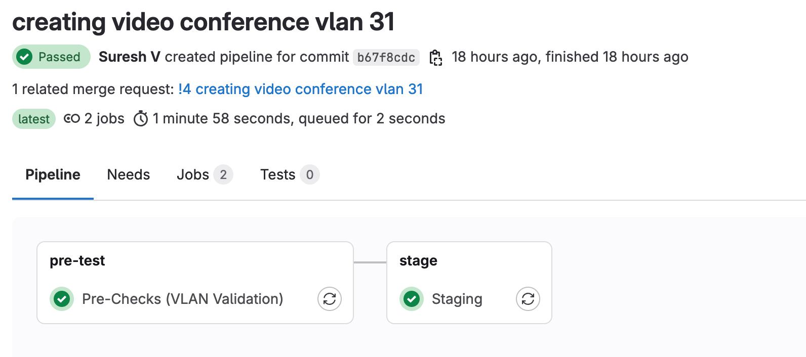 If the pipeline passes (i.e., the VLAN ID is valid and the configuration has no errors like an invalid IP address), the next step is to create a merge request. This signifies that you want to merge your new branch into the ‘main’ branch. Once the merge request is created, someone from your team can review and approve it.