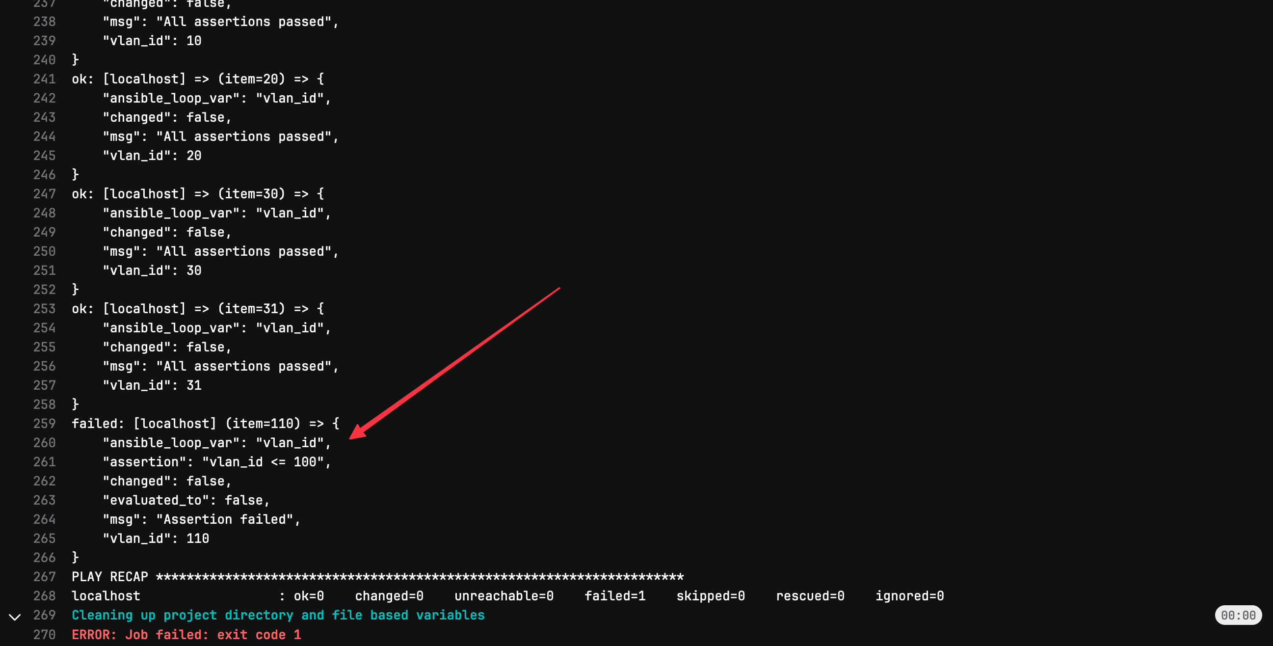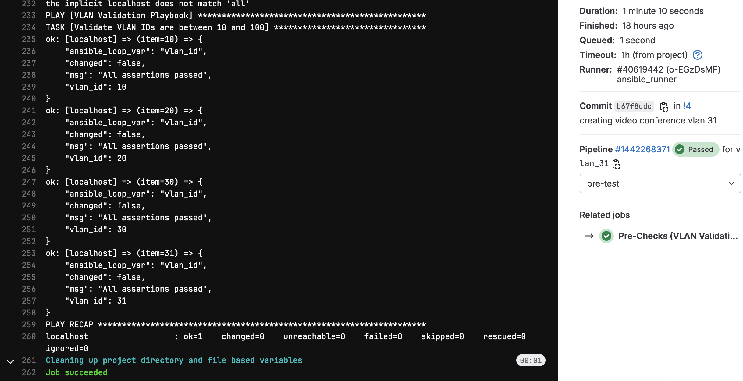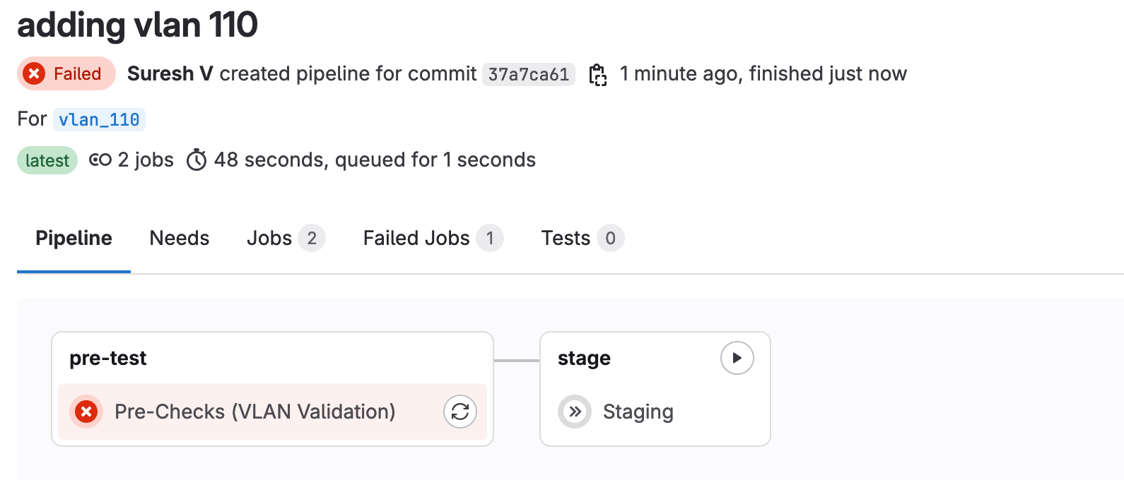 Let’s cover an example of a failing test. Imagine one of our colleagues, unaware of the VLAN ID range we should be using, picked VLAN 110. As usual, they create a branch, add the new VLAN, and push it to GitLab. What do you think will happen? Well, the VLAN validation test will fail because 110 is outside the allowed range. From the console output, we’ll be able to see exactly what went wrong, allowing us to catch this error before it’s deployed.