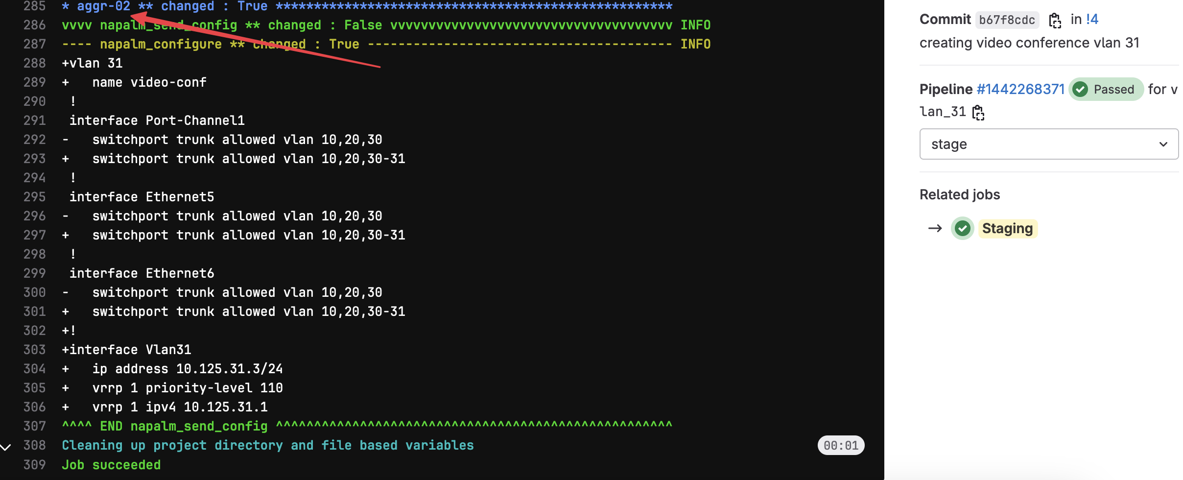 Below you can see that the 'Staging' job outputs what will happen if we apply the change. Anyone reviewing the change can easily see this and make a decision on whether or not to approve the merge request. The below snippet shows the config diff for aggr-02
