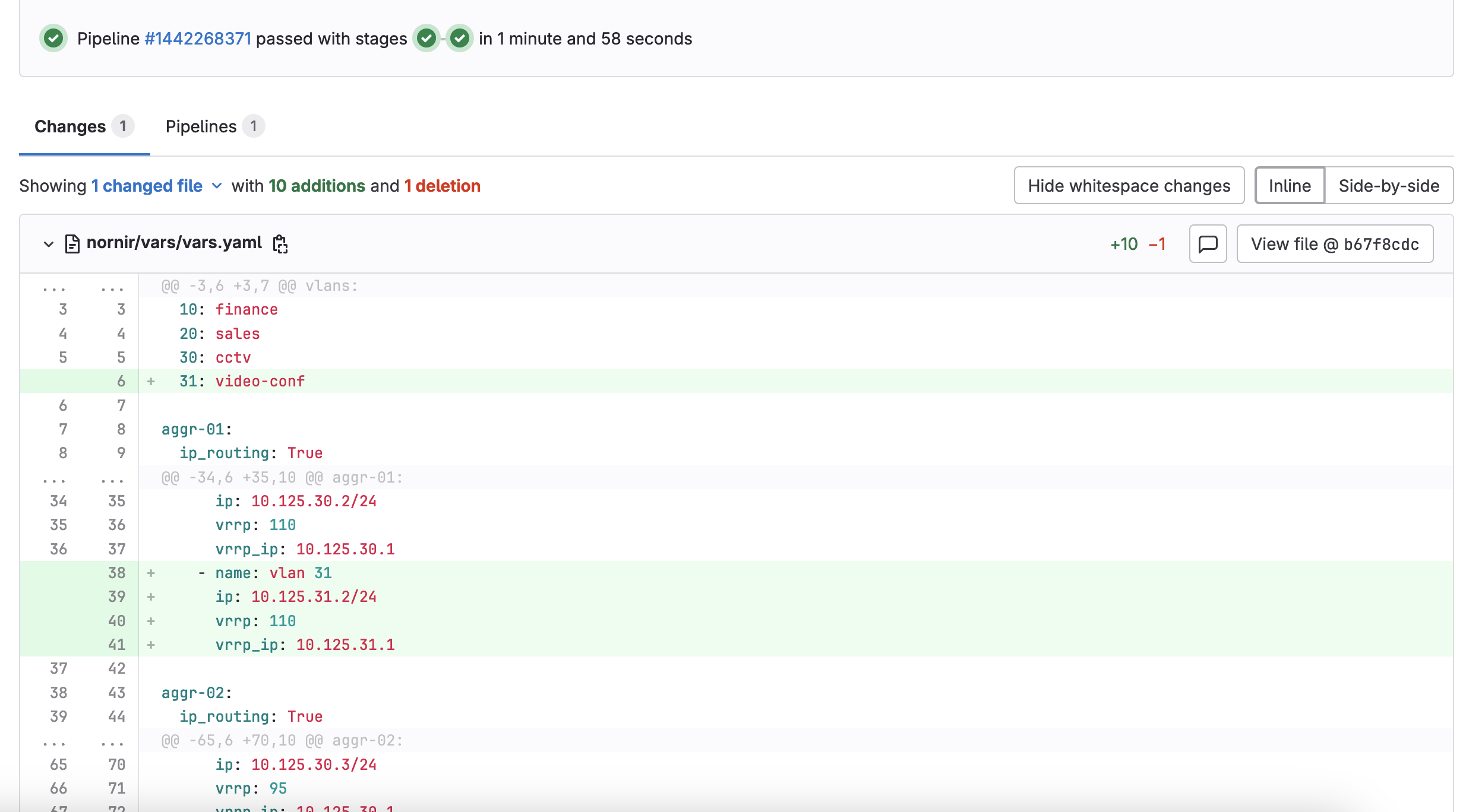 When we create a merge request, GitLab provides a nice visual representation of the pipeline status and the file changes, making the approver’s job easier. Your colleague can review the changes, like the addition of the new VLAN, and approve the request.