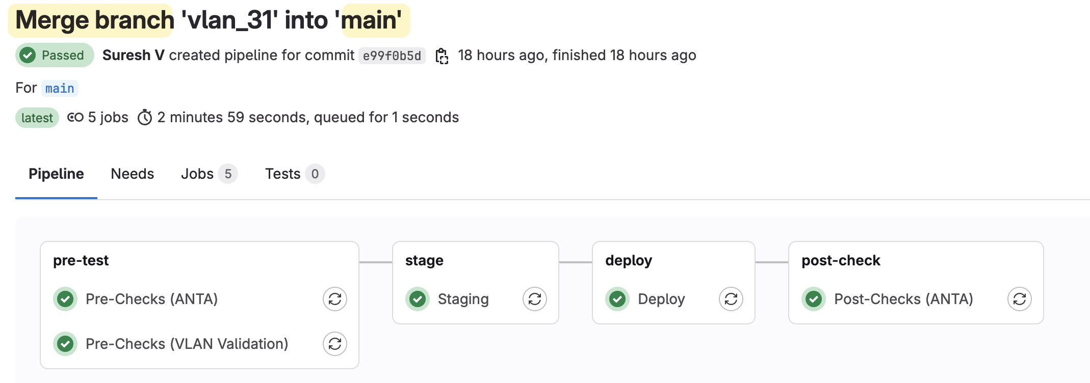 - mainThe Pre-Checks (ANTA) stage runs a series of tests using Arista’s ANTA framework, but it is configured to run only in the main branch, as indicated by the only: main directive. This ensures that these tests run only when changes are merged to the main branch. Similarly, Pre-Checks (VLAN Validation) validate the VLAN configuration using Ansible, making sure the VLANs meet the requirements before proceeding.
