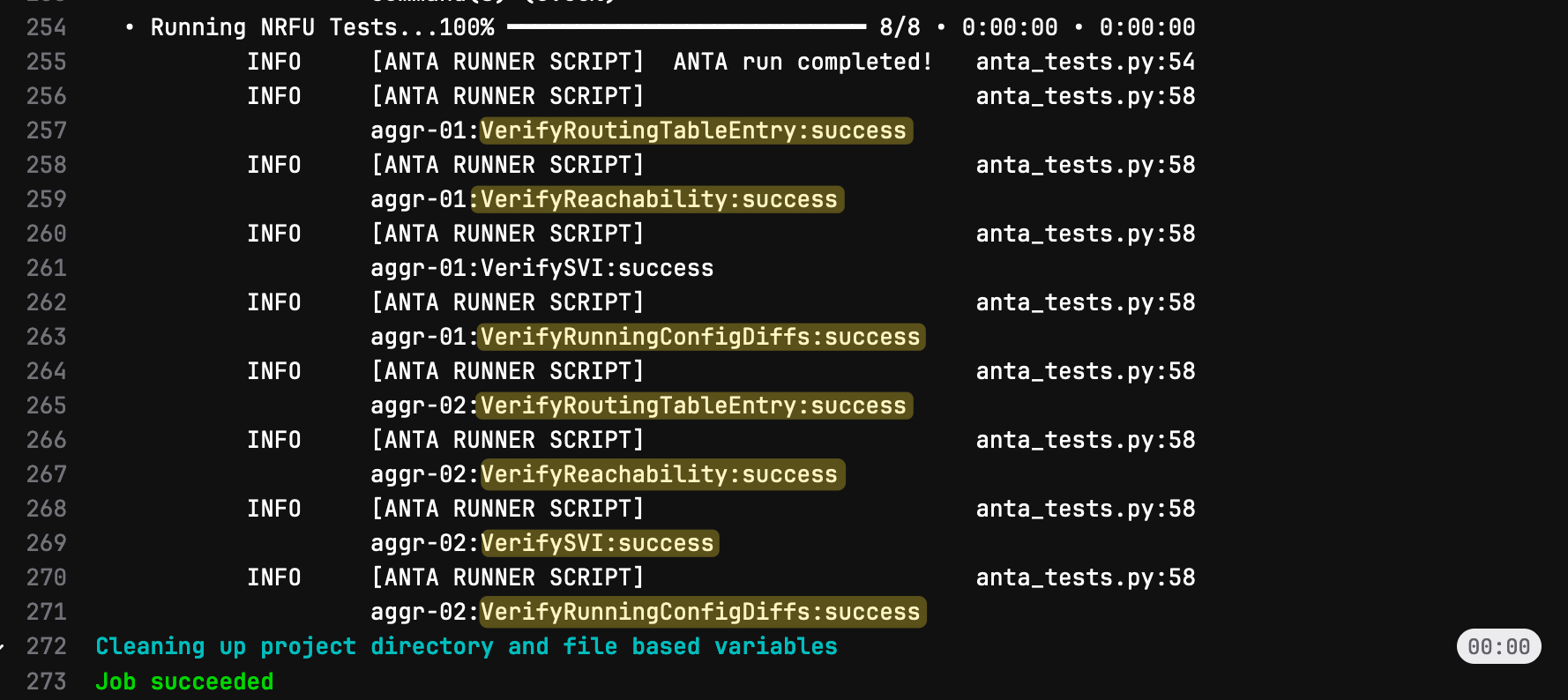 Similar to what we did before, we can click on each job to see the console output for each stage. This gives us detailed insights into what happened during each step. Here’s the console output from the ANTA tests, where we can see the results of the checks, such as verifying the default route, SVIs, and Port-Channels. This helps us confirm that the network is functioning as expected after the new VLAN was added.