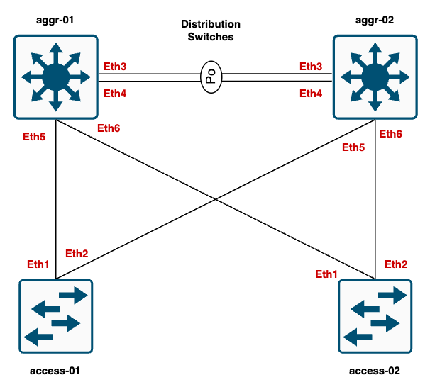 Here, I’m using a simple 2-tier campus network. I have two access switches that connect to the distribution/aggregation switches. In real-world scenarios, you might have multiple access switches, but for simplicity, I am only using two. The default gateway for the VLANs is on the distribution switches. The distribution switches run VRRP between them, where aggr-01 is the primary, and aggr-02 is the secondary.