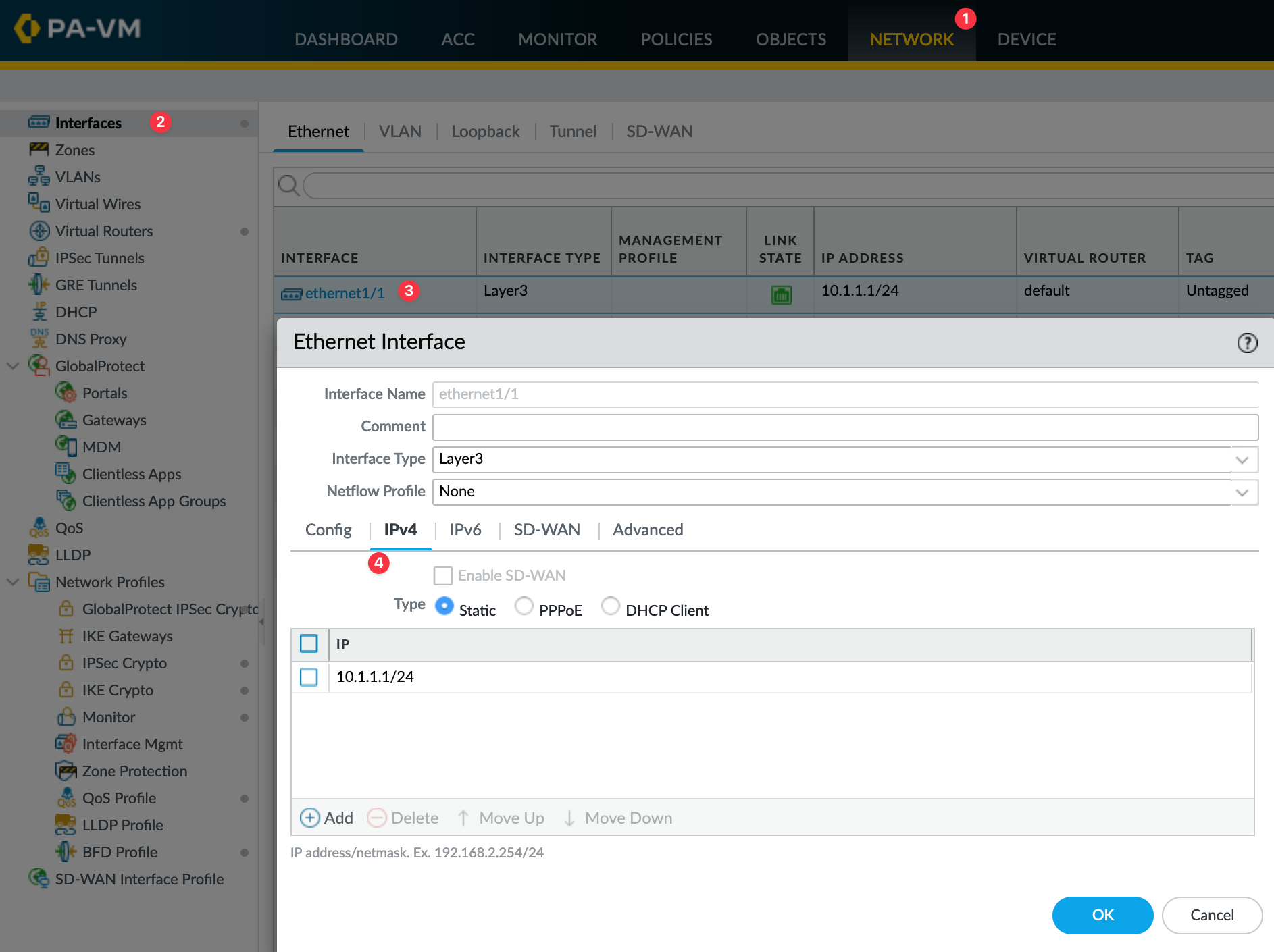 To configure an interface, navigate to Network > Interfaces > select the interface. Here you can assign the IP, add an interface to a zone or any interface-related configuration.
