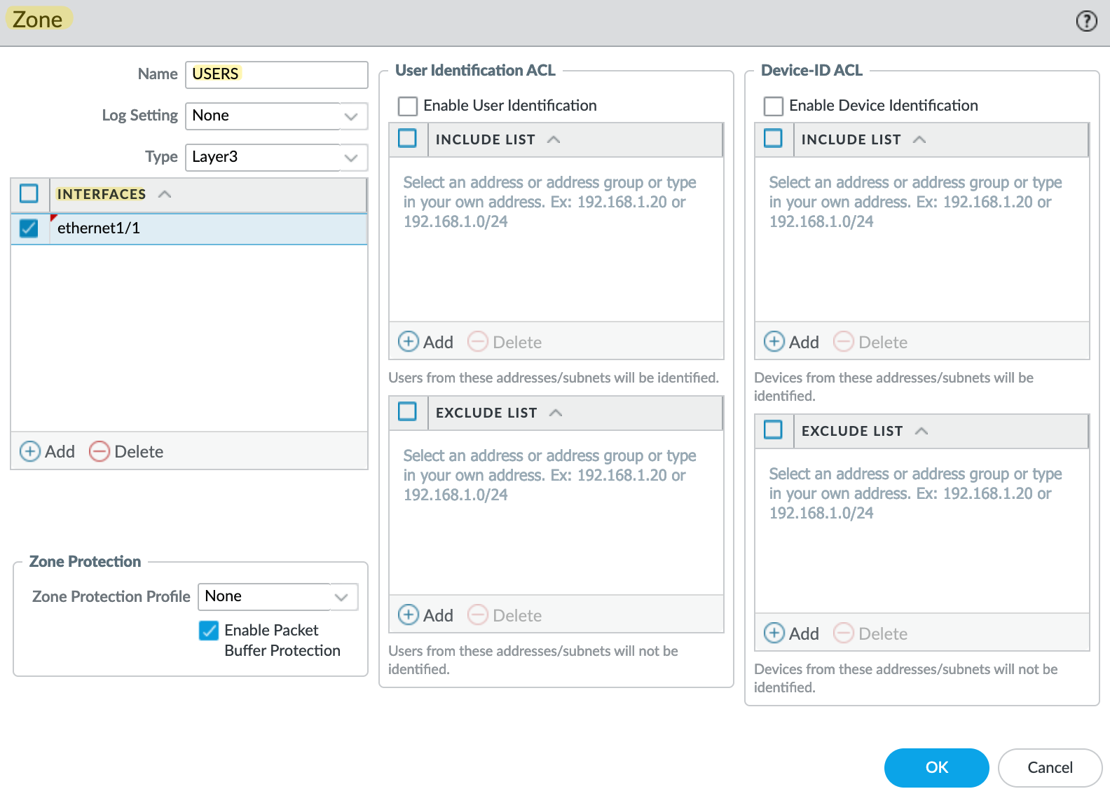 To Configure a zone, navigate to Network > Zones and add a new zone. Here you need to select the 'Type' as 'Layer3' and add the interface we created earlier for the 'users'