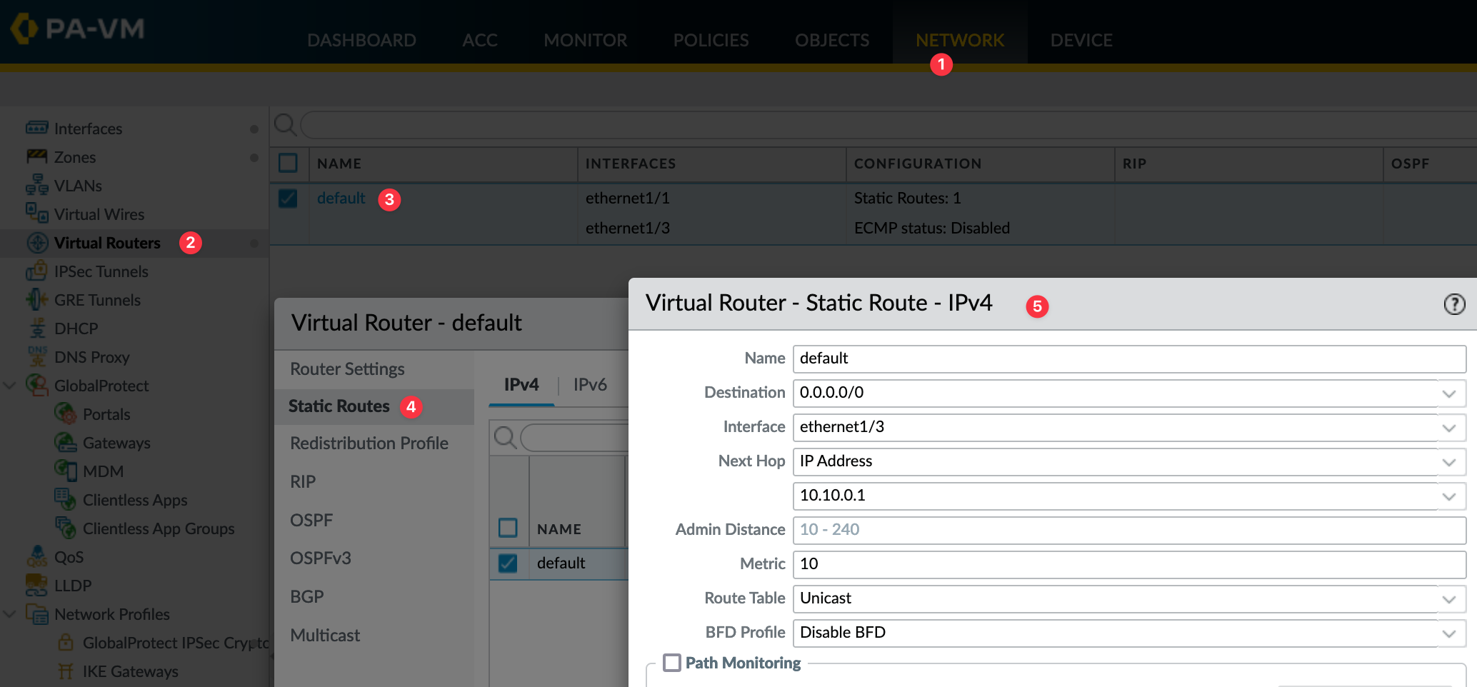 To configure a static route, navigate to Network > Virtual Routers > 'default' > Static Route and create one with the next-hop as shown below.