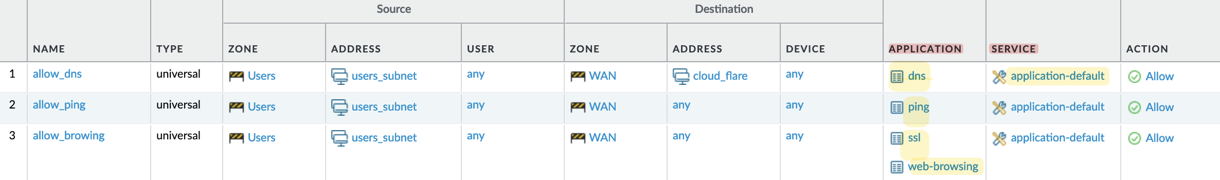‘App-ID’ is a term used to identify applications instead of relying solely on hard-coded TCP/UDP port numbers. It’s 2024, and we are using a Next-Generation Firewall (NGFW), so we aim to inspect not just at Layer 4 but also look into the application layer. Here’s how I’ve set up three initial policies.