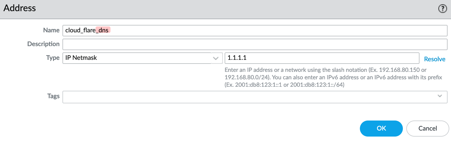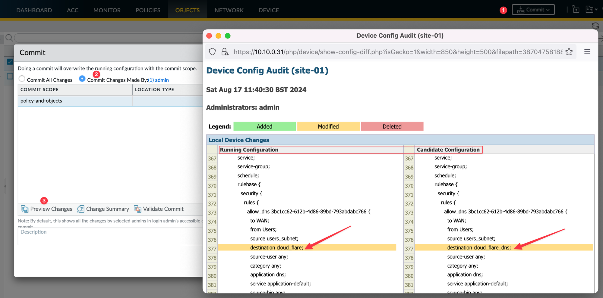 To demonstrate this, I renamed the 'cloud_flare' address object to 'cloud_flare_dns'. These changes won’t take effect until I commit them.