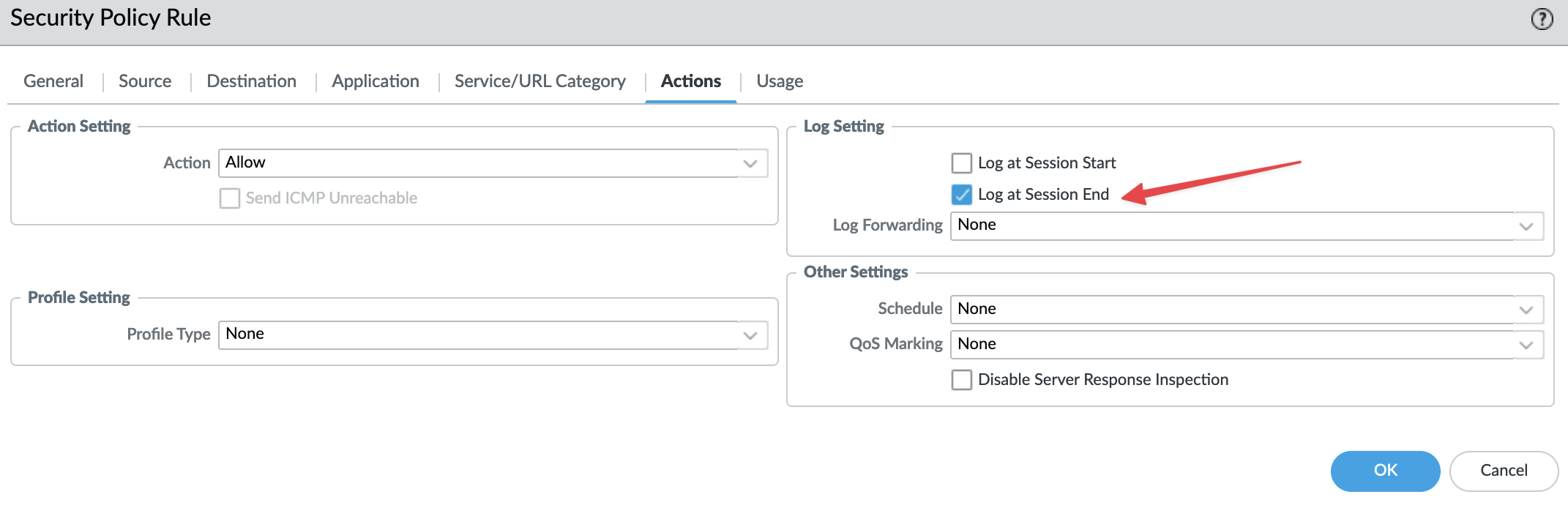 Here, you have two options - ‘Log at Session Start’ or ‘Log at Session End’. I generally prefer using the latter to avoid rapidly filling up storage space with logs. With ‘Log at Session End’, the firewall logs the details of a session when it terminates, such as when a user visits a website and then closes it. This termination removes the session from the session table and triggers the firewall to log the traffic, allowing you to review it afterwards.