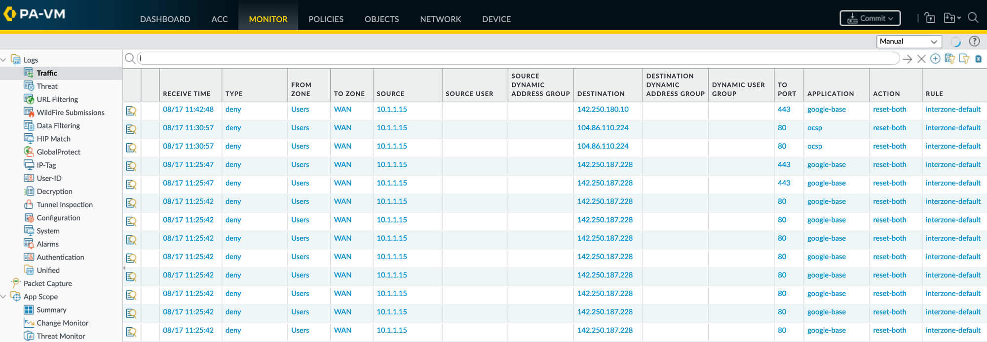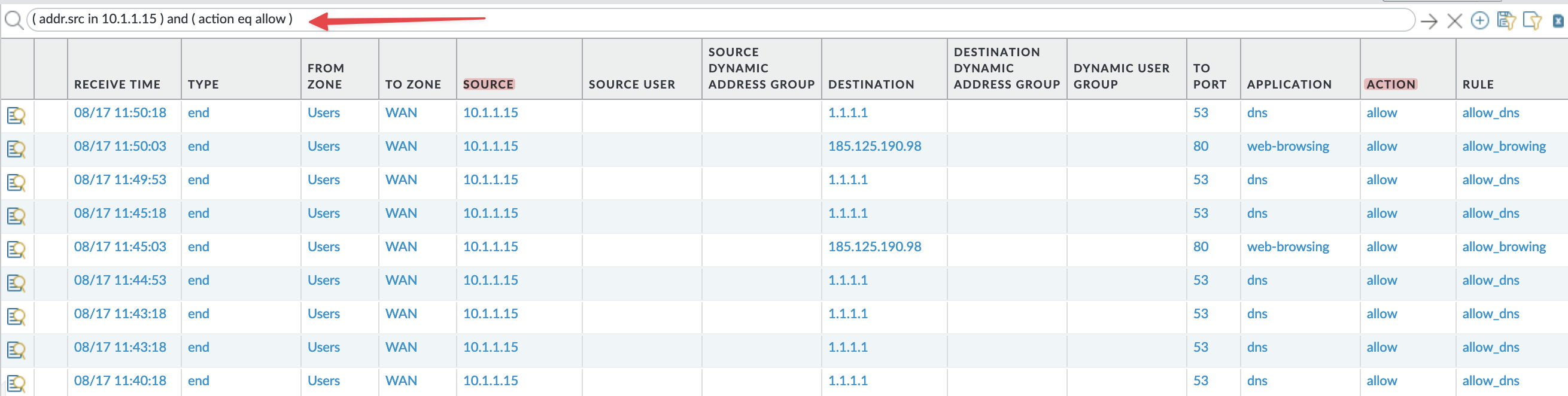 Filtering the traffic logs is as easy as selecting a value from the traffic log output. For example, if you want to see all the ‘allow’ traffic from ‘10.1.1.15’, all you have to do is select a value from the ‘Action’ column and also select a value from the ‘Source’ column as shown below. This selection allows you to quickly and easily isolate specific traffic events, making it simpler to analyze user activities or troubleshoot network issues.