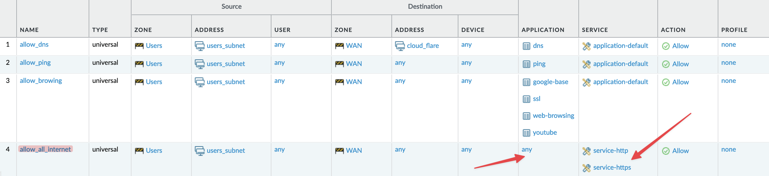 Alternatively, you could allow ‘services’ like TCP/80 and TCP/443, though this approach undermines the advantages of having an NGFW. So, if you need to allow traffic on port numbers, you need to set the 'application' to 'any' and use port numbers instead as shown below. Palo Alto firewall has some pre-defined 'services' such as 'http' or https' (which I've used in the example below) but you can also create your own custom services by navigating to Objects > Services.