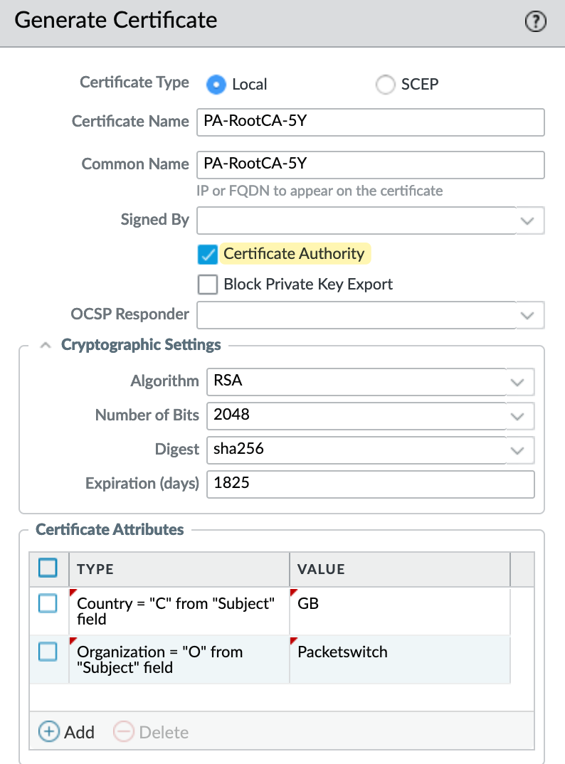 As I mentioned before, I'm generating a root certificate on the firewall, this acts as the top-level CA. Navigate to Device > Certificates and click on Generate