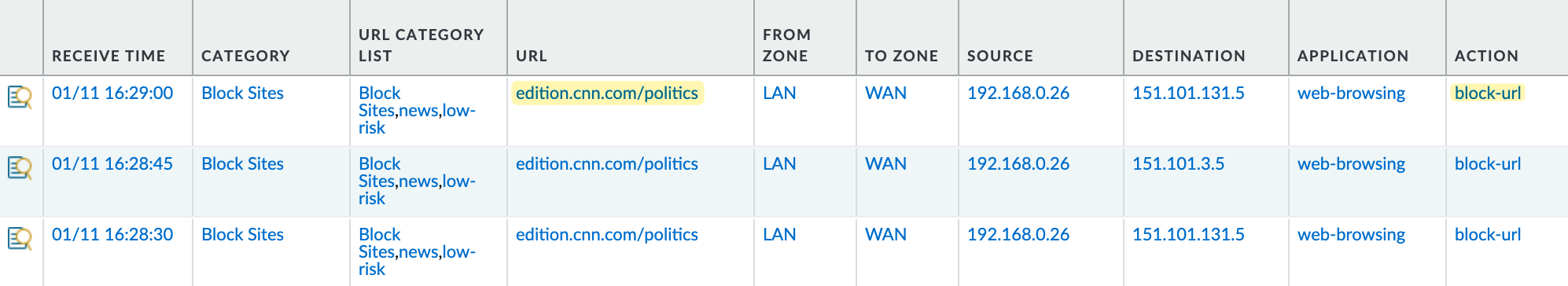 I also recorded my screen to demonstrate the behaviour in action. You can watch the recording to see how cnn.com is accessible, but navigating to the 'politics' section results in the traffic being blocked.
