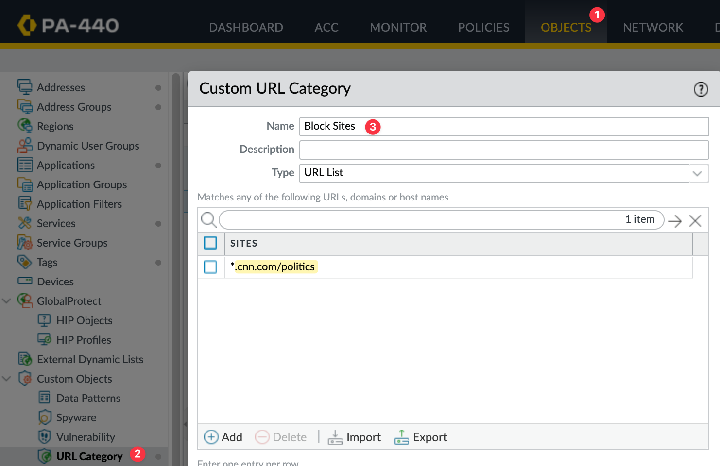 To demonstrate this, I'm going to create a custom URL category to block, specifically cnn.com/politics, and set this category to block.
