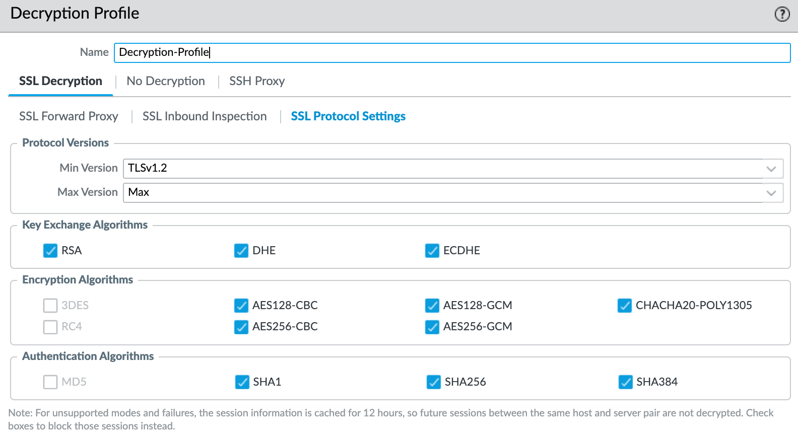 A decryption profile allows you to perform checks on both decrypted traffic and SSL traffic that you choose to exclude from decryption. I'm just going to create a profile as shown below. You can create a Decryption Profile by navigating to Objects > Decryption > Decryption Profile.