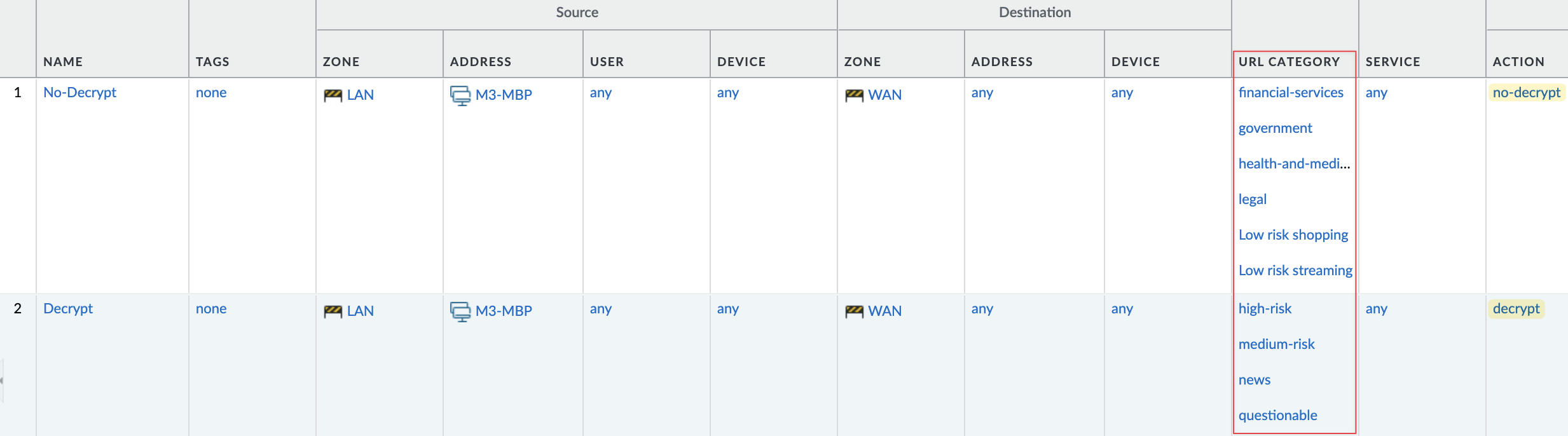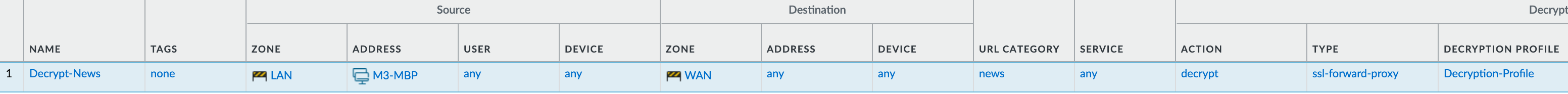 So now, every time I access a site classified as 'news', 'high-risk, 'medium-risk' and 'questionable', the traffic will be decrypted. I can also create a policy with the action 'no decrypt' for certain exclusions, such as personal finance or medical sites. Then, I can create another policy below it to 'decrypt' everything else.