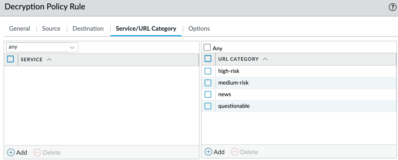 A Decryption Policy rule allows you to define the traffic that you want the firewall to decrypt and to define the traffic that you choose to exclude from decryption. You can create a Decryption Policy by navigating to Policies > Decryption.