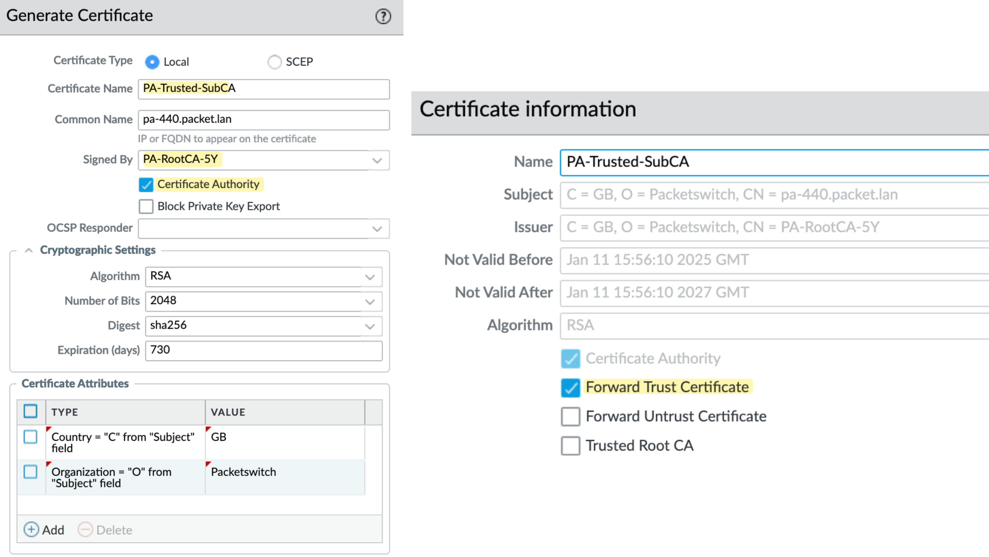 Next, I create a subordinate CA certificate and have it signed by the root CA we created in the previous step. Once the certificate is generated, open it and make it a 'Forward Trust Certificate'