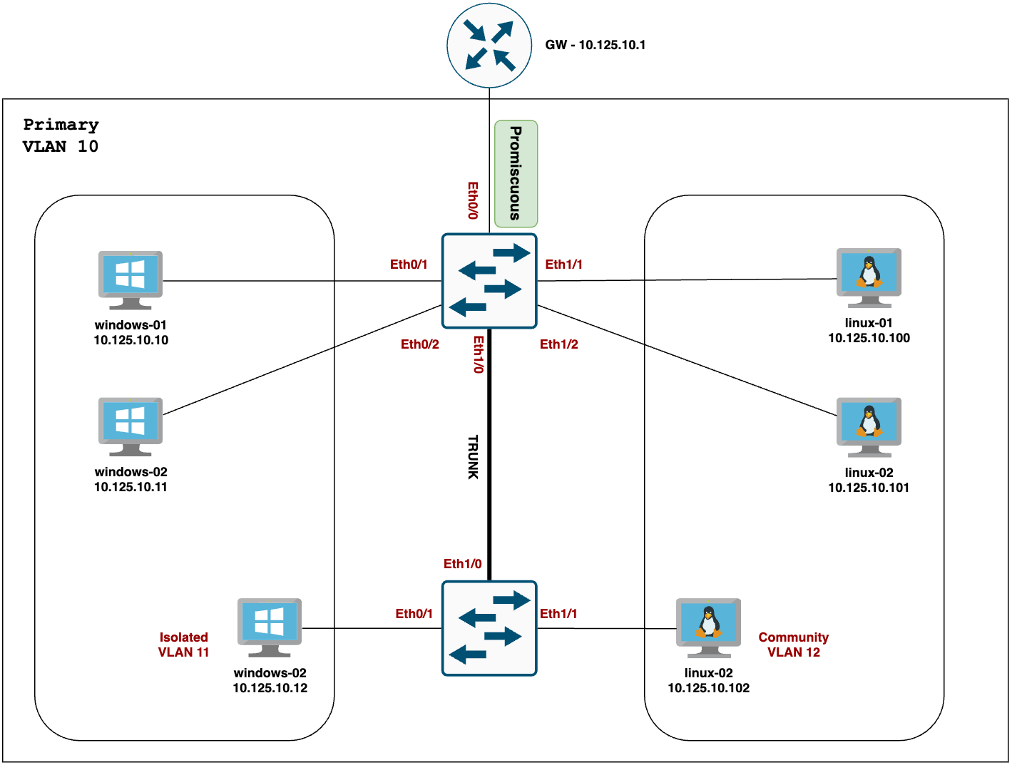 In our example, I’m going to add a new switch to the mix and apply the following configurations. The windows/linux devices behave the same - Windows can only talk to the promiscuous port (through the trunk), and Linux can talk to the promiscuous port and other community VLAN ports.