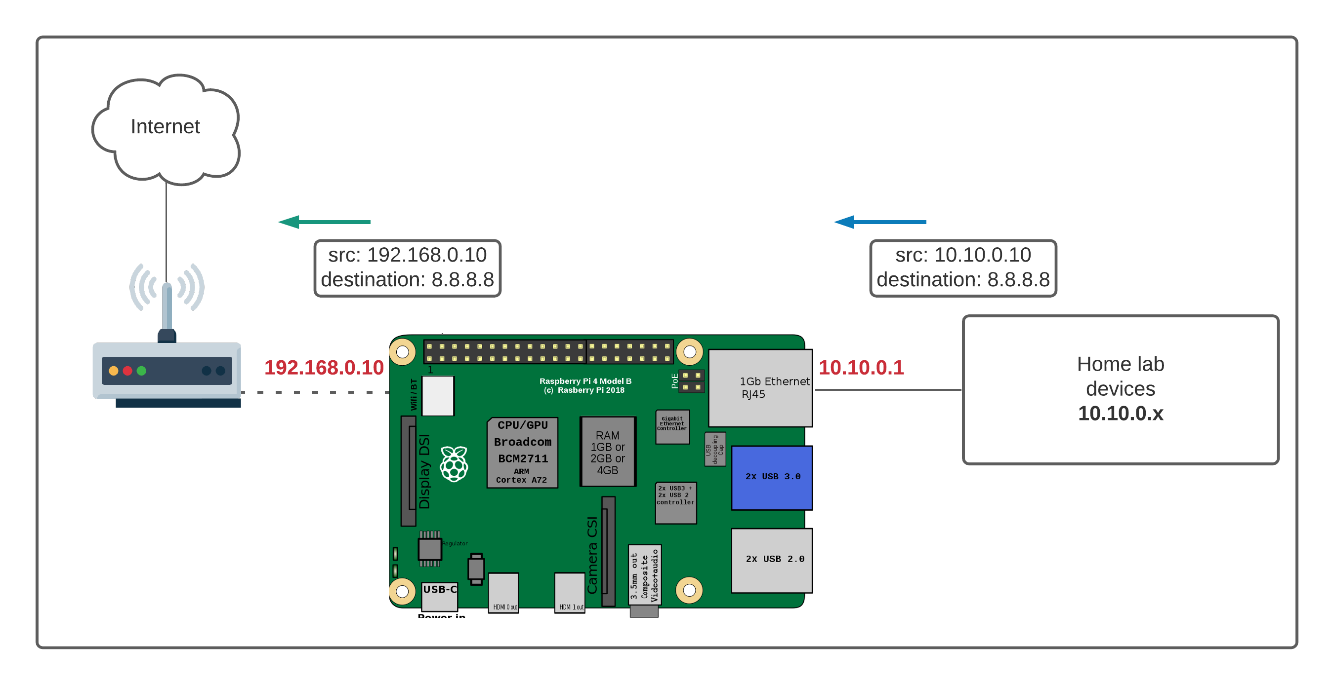 - Home lab devices get an IP address in the 10.10.0.0/24 subnet and use 10.10.0.1 as the gateway (Pi is the gateway for the lab devices)