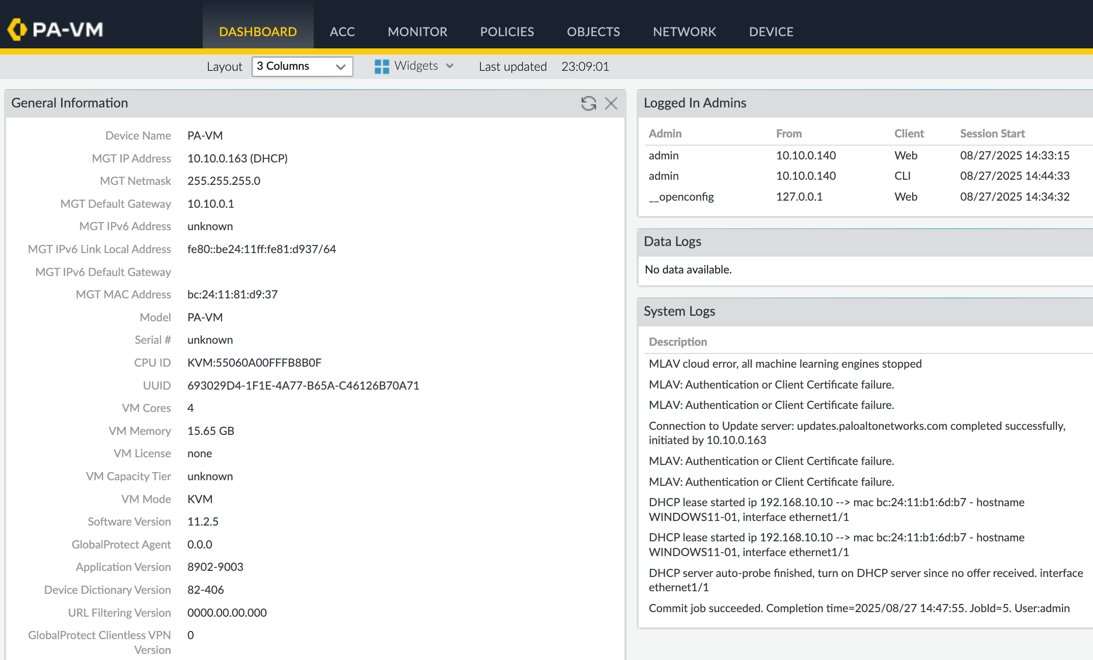 If you have DHCP running on the network where the management interface is connected, the firewall will automatically get an IP address, and you can also see it from the Proxmox console. If DHCP is not available, you need to log in to the Palo Alto VM through the CLI using the default credentials (admin/admin) and manually assign a management interface IP. You will also be prompted to change the default admin password during the first login.