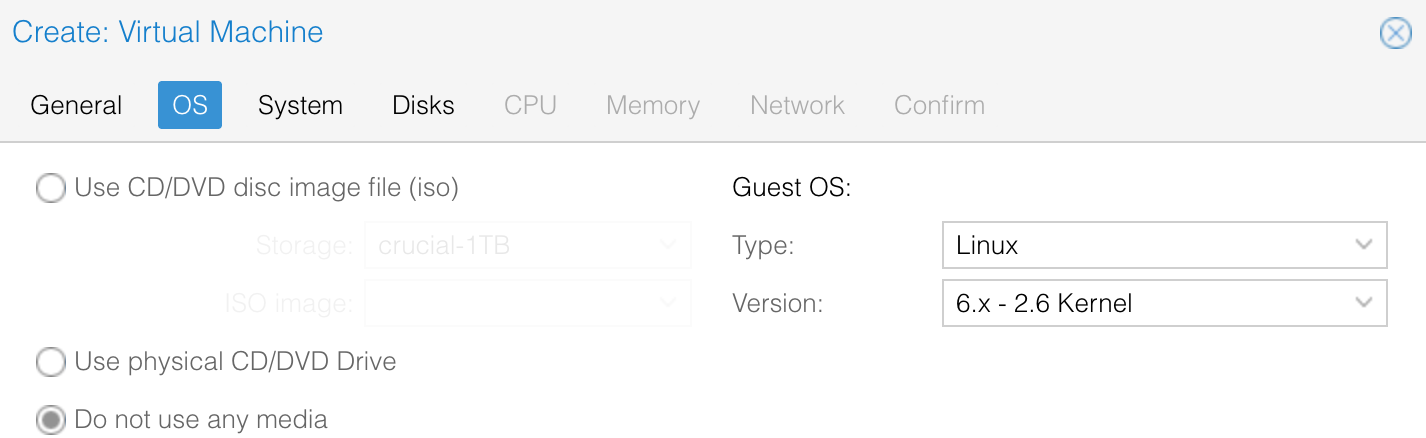 For the OS tab, "Do not use any media" since we are not booting from an ISO.