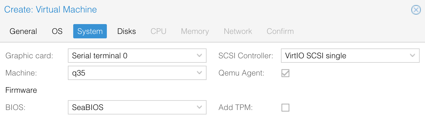In the System tab, I changed the machine type to q35, BIOS to SeaBIOS, and kept the Qemu Agent enabled.