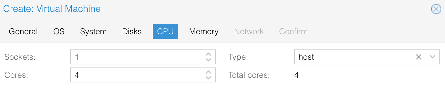 On the CPU tab, I assigned 4 cores with the type set to host.