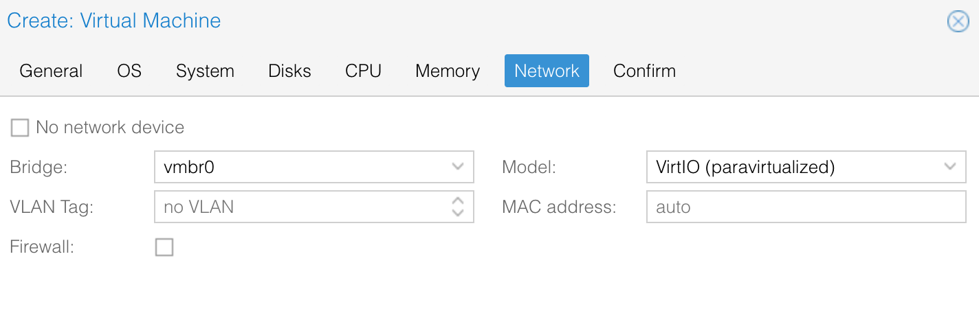 For Network, I added one NIC to start with, choosing VirtIO as the model.