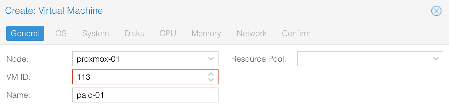 I created the VM using the Proxmox GUI, and the screenshots below show the options I selected. Under General, I gave the VM a name and ID.