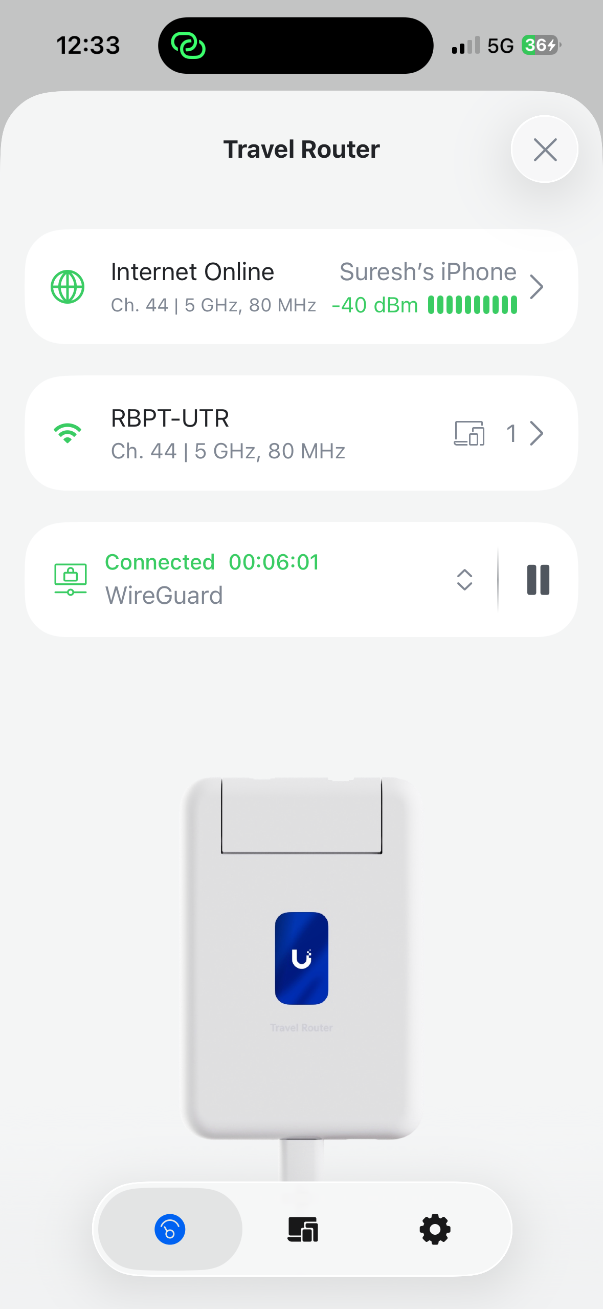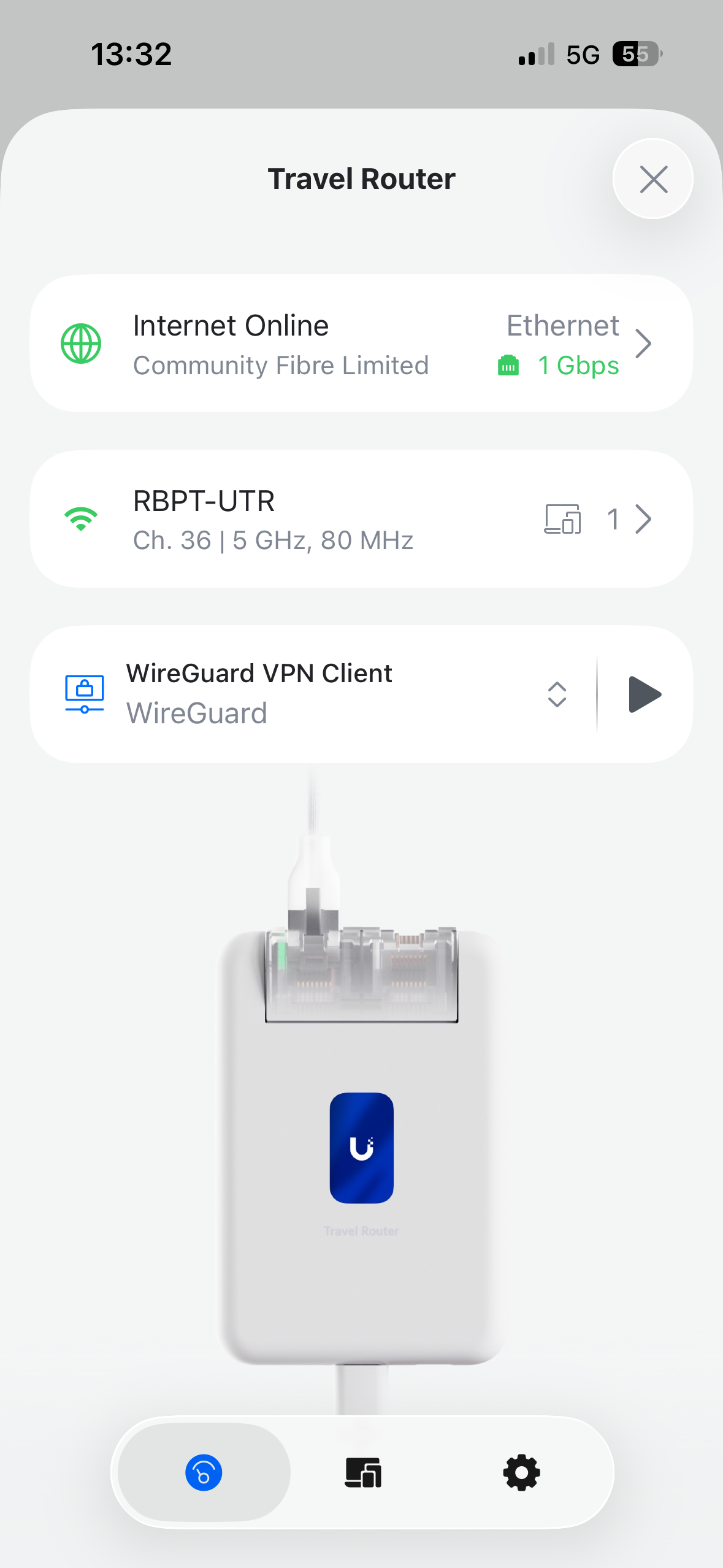 Once everything was set up, I wanted to put it to the test. I connected the WAN uplink to my mobile hotspot, connected my laptop to the UTR's SSID, and enabled the WireGuard VPN using the button in the app. It worked pretty well overall, though when I tested it multiple times repeatedly, it sometimes failed to connect or took a while. I'll test this more thoroughly and update this post if I find anything worth noting.