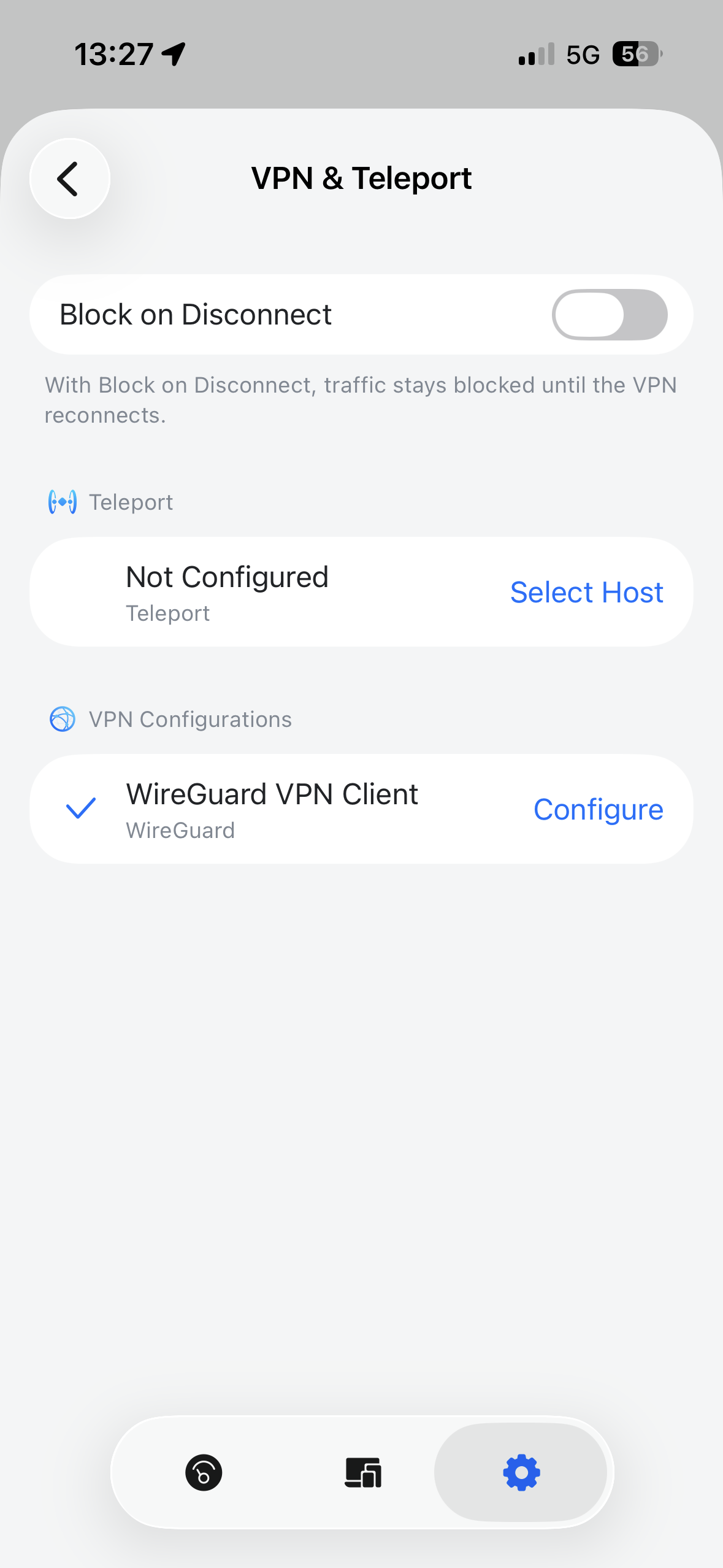 Since I don't have a Cloud Gateway, I can't use Teleport, so I had to use WireGuard instead. A Cloud Gateway is a UniFi device that acts as your router and firewall, and Teleport is UniFi's own VPN solution that comes built into it.