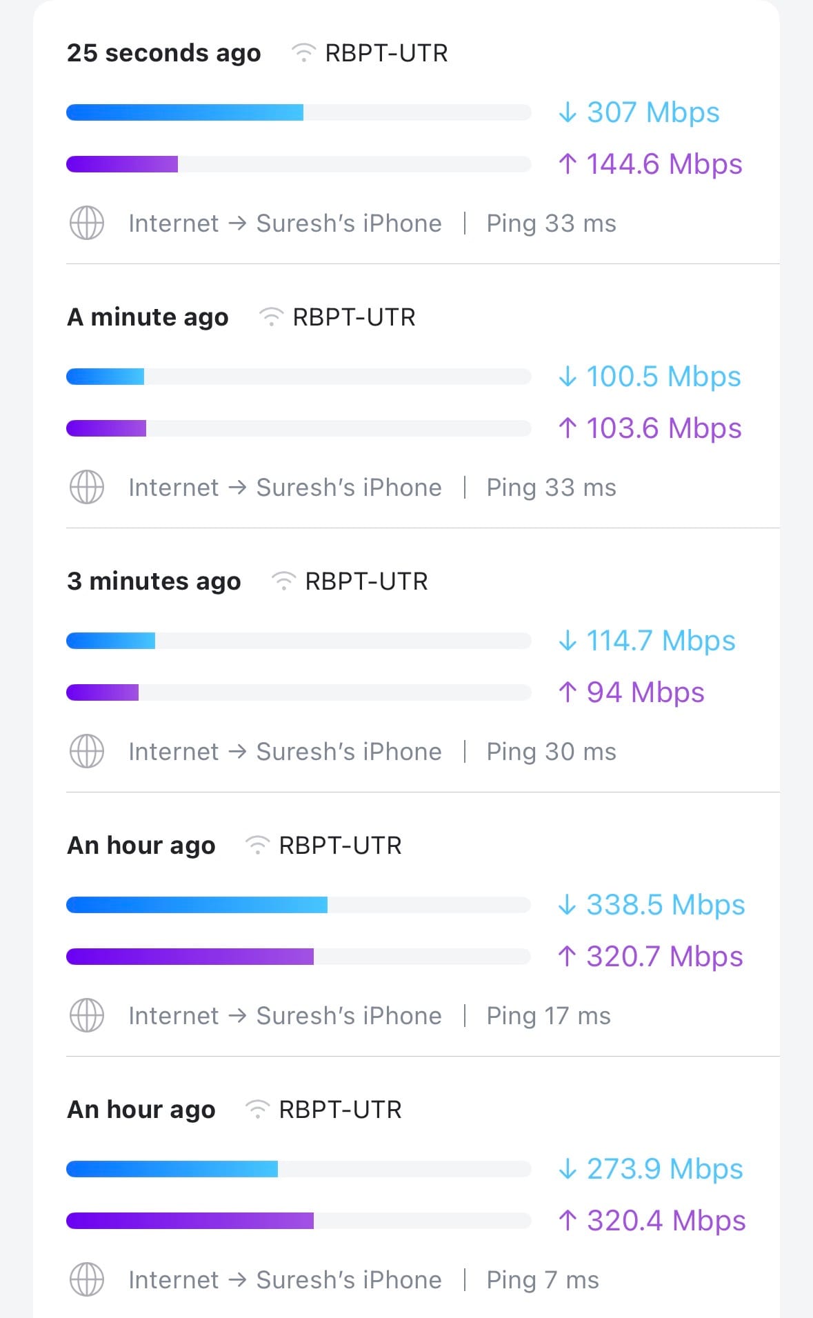 I connected my home Internet (2.5Gb/s symmetric fibre connection) to the UTR's WAN port, then connected my laptop/iPhone to its SSID and disabled WireGuard initially for the test.