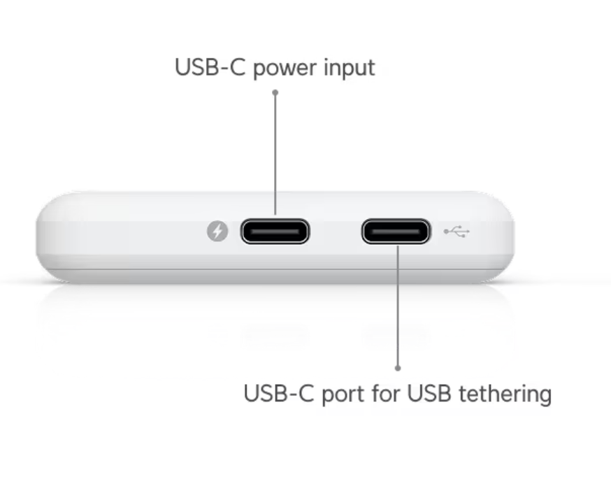 The UTR has two USB-C ports, one for power and one for tethering. You can power it from your phone, but if you do that, you can't use USB tethering at the same time since both functions use separate ports. To use USB tethering, you need a separate power source for the UTR and then connect your phone to the tethering port (this will also charge the phone). In my testing, though, USB tethering was quite unstable and kept disconnecting.