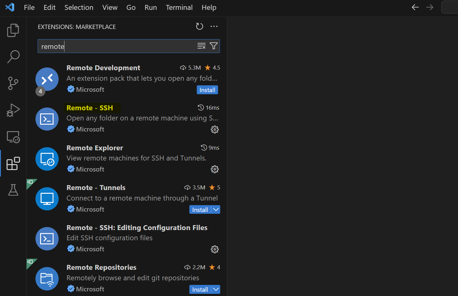 Open VSCode in your host machine, install the extension called 'Remote - SSH' as shown in the following image.