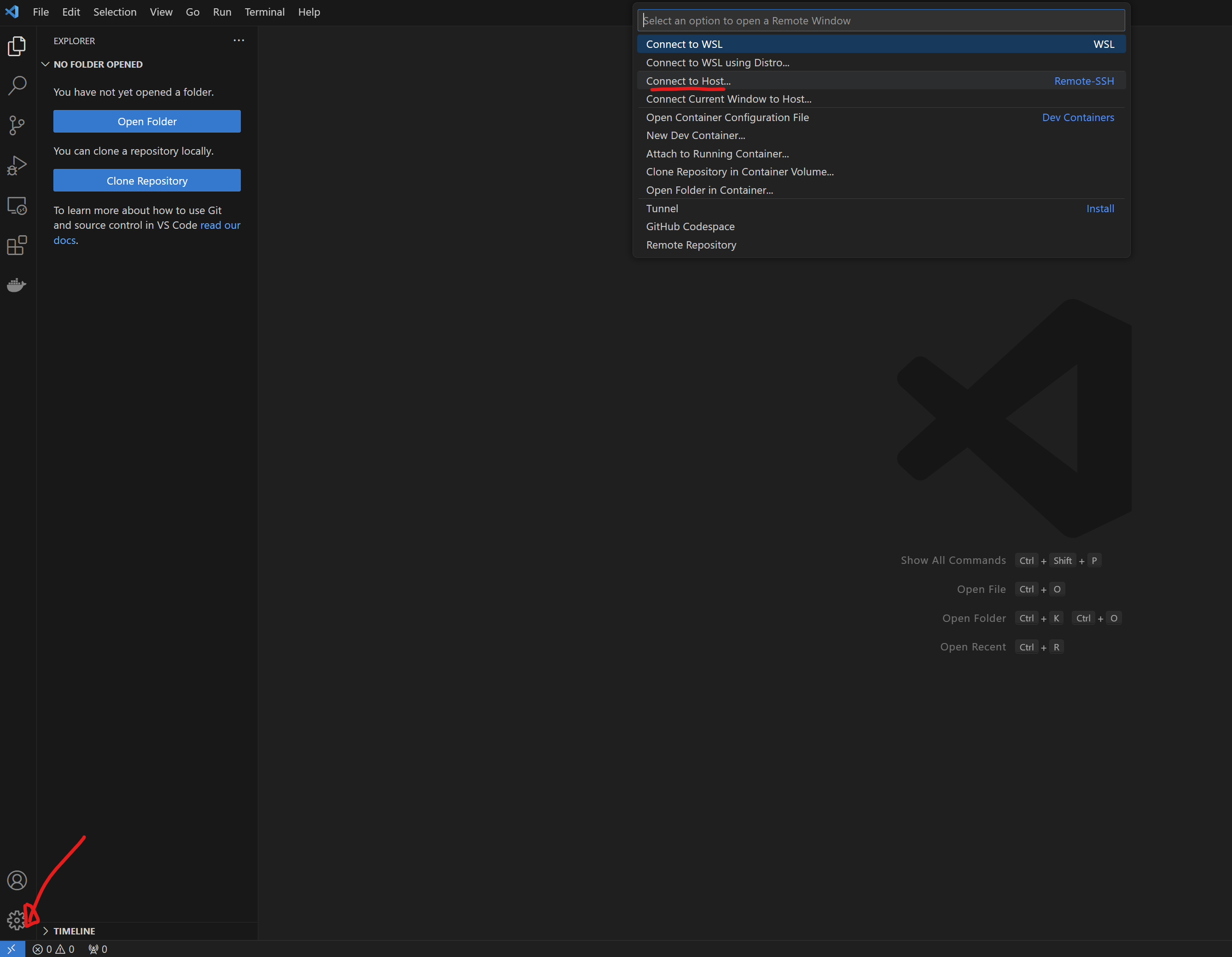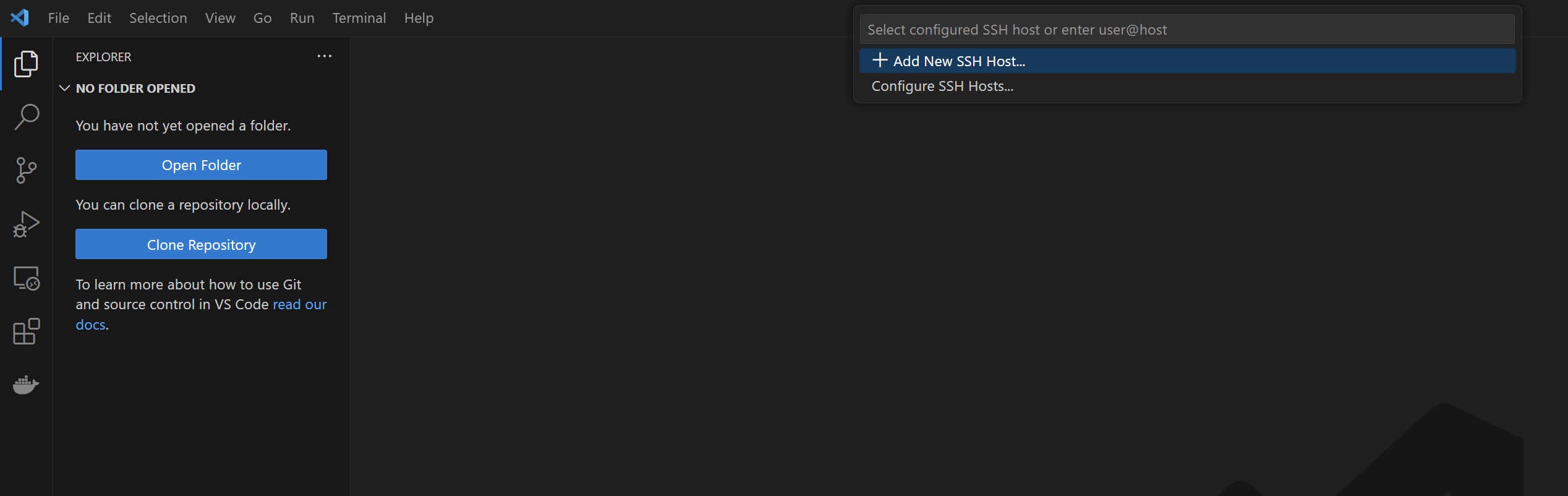 Once you’ve installed the Remote - SSH extension, click on the blue icon in the bottom left corner of the VSCode window. From there, select 'Connect to Host...' to initiate a connection to your remote environment.