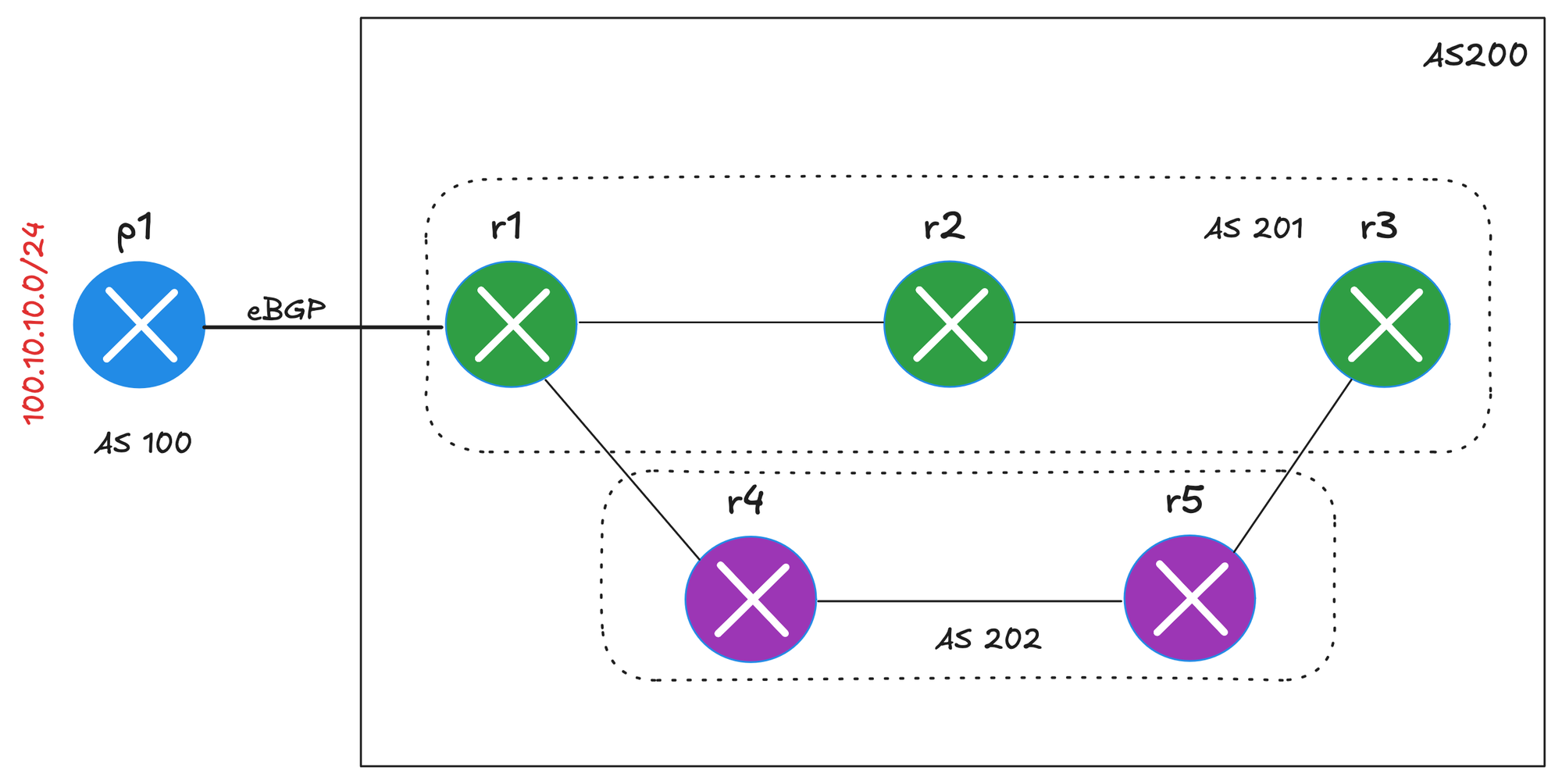 To someone external to our AS, AS 100 in this example, the whole confederation is hidden. Even though we are internally using sub-AS numbers like 201 and 202, those are only used inside our AS.