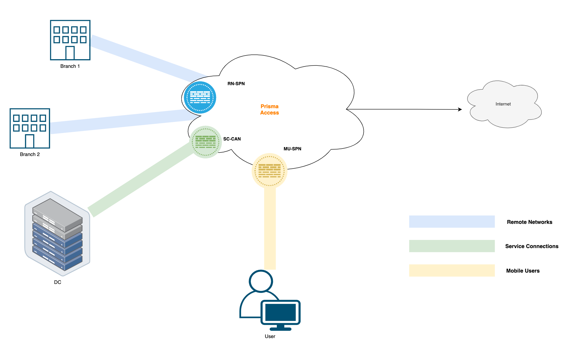 Just to summarize, Remote Networks terminate their IPSec connections on the Prisma Access RN-SPN node. Service Connections terminate their IPSec connections on the SC-CAN node and Mobile Users terminate their VPN connections MU-SPN node as shown below.