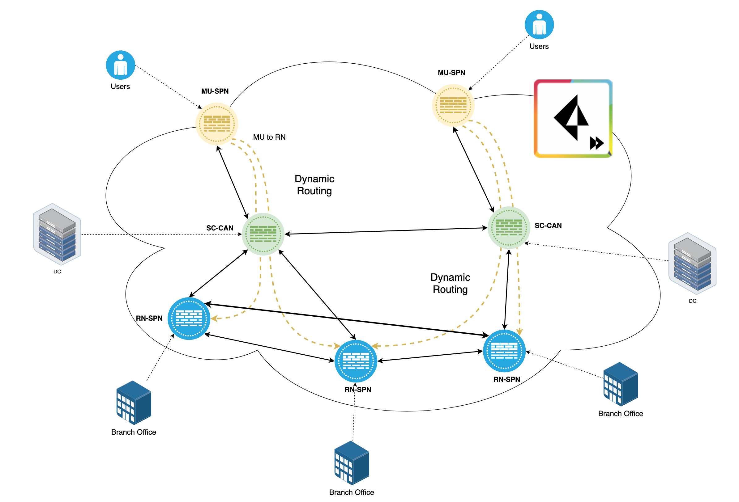 MU-SPNs always connect to the geographically closest SC-CAN. Through this SC-CAN, Mobile Users can reach any Remote Network within a single hop. If an outage in the cloud causes routing or tunnel issues, this traffic traverses a different path to reach the remote Network.